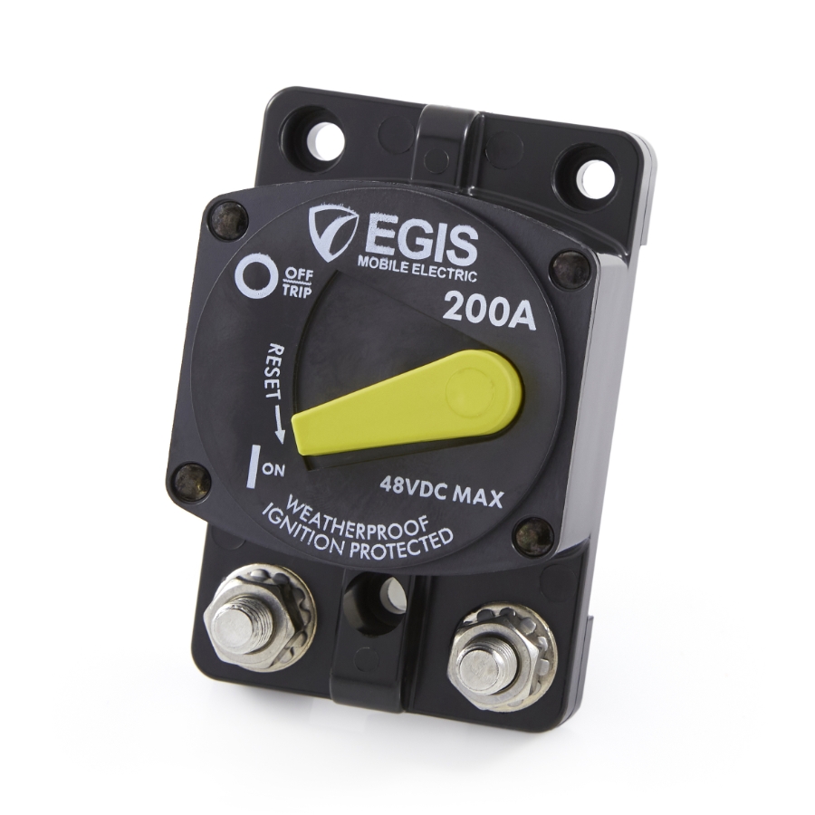 Egis Mobile Electric manufactures the Series 47 ignition-proof circuit breaker line. These 200- and 250-amp breakers are made for demanding uses including police and emergency vehicle applications. They offer robust construction, weatherproof housing, easy-to-mount surface mount or panel mount designs, stainless steel hardware, and a high visibility ON/OFF lever.