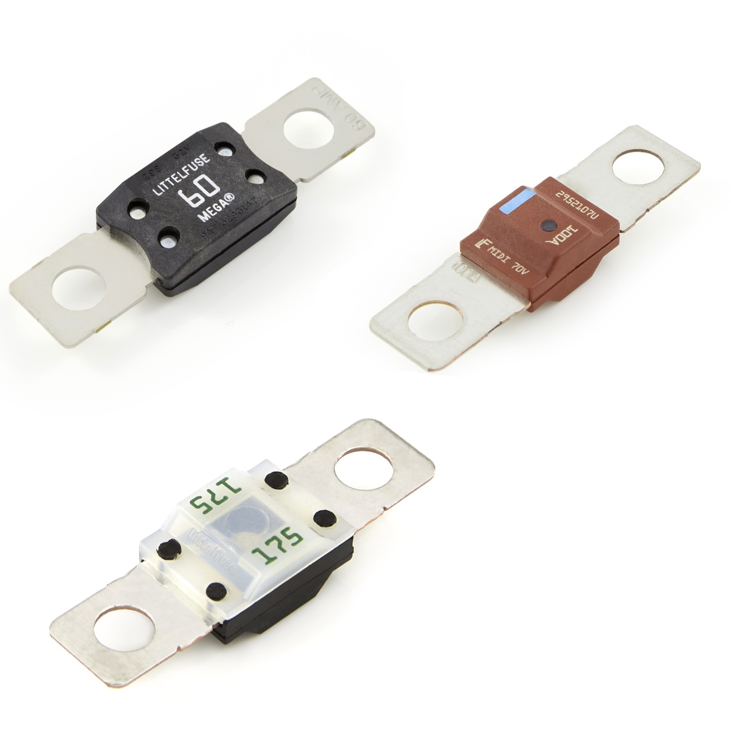 High-current circuits typically use bolt-down fuses (a few examples shown at right) such as AMI/MIDI or AMG/MEGA styles, installed in heavy-duty fuse holders designed to withstand vibration. Lower-current circuits often use blade-style fuses installed in fuse blocks for easy access and service.